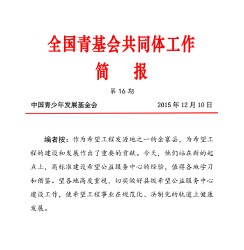 团县委负责人将于12月21日赴北京参加“2015希望工程合作伙伴大会”,就希望公益服务中心建设工作进行交流发言。下一步,金寨县希望公益服务中心将推进“一二三三”工作法,围绕一个思路,推进希望公益服务社会化;坚持二个拓展,从义务教育向非义务教育拓展,从钱务捐赠向人文关怀拓展;搭好三个平台,即社会公益平台,捐方服务平台,公益文化交流平台;完善三个体系,即社会化工作体系、社会化服务体系、社会化监督体系;确保金寨县希望公益服务中心工作走在全国前列。