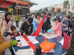 为增添新春佳节气氛,展示书法培训成果,2016年元月26日下午,金寨县青少年活动中心书法班师生一行20余人走上街头,开展义务“迎新春、写春联、送祝福”大型公益活动。金寨县书协主席张思九以及书法名人吴沐森、王怀瑞等应邀参加此次活动,给活动添彩增色。书法班学员初生牛犊,跃跃欲试,情涌笔端,毫不示弱;书法名家笔力老道,挥毫泼墨,意到笔随,墨香情浓。现场十分火爆,引来众人驻足观赏,赞不绝口。