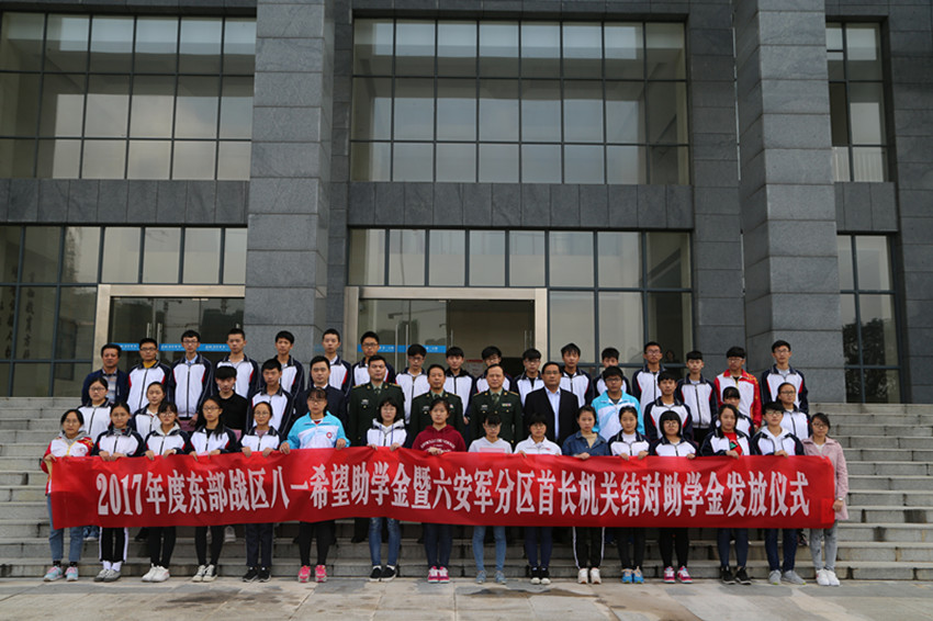 仪式上,六安军分区和县领导向25名家庭贫困、品学兼优的高中生发放了每人2000元的八一希望助学金,向15名家庭贫困、品学兼优的高中生发放了每人1000元的首长机关结对助学金。