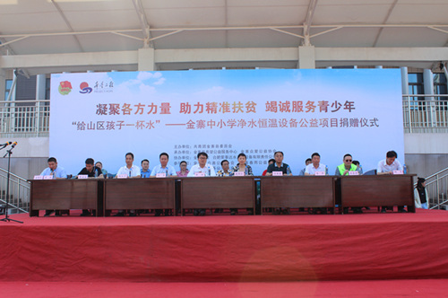 6月1日下午,“给山区孩子一杯水”——金寨中小学生净水恒温设备捐赠仪式在金江实验学校举行,共青团六安市委书记张柱,县委常委、组织部长赵锦文,安徽国防科技职业学院团委副书记张红军,荣事达合肥净水工程事业部总经理刘东,县关工委、扶移局、教育局、希望公益服务中心、众爱、众善、春雨、乐善公益协会相关负责人以及金江实验学校师生代表一百多人参加活动,仪式由团县委负责人詹越主持。