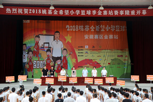 2018年7月1日下午3时,“2018姚基金希望小学篮球季金寨站”开幕式在安徽金寨职业学校体育馆隆重举行。金寨县县委常委、组织部长赵锦文、安徽金寨职业学校校长王先根、金寨县全民体育健身中心副主任胡先柱、姚基金督导柴修超、金寨县希望公益服务中心秘书长周玉梅、金寨县三个农民电子商务有限公司总经理、金寨县大别山石沁泉水有限公司董事长童维新出席开幕式,来自金寨县、寿县、霍邱县的26队伍及金寨站活动组委会共计450余人参加开幕式,开幕式由团县委负责人詹越主持。